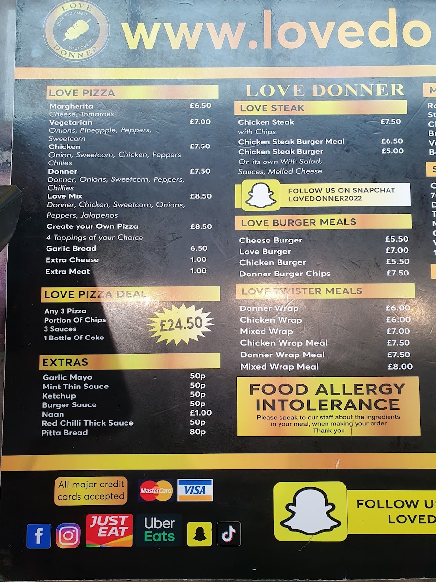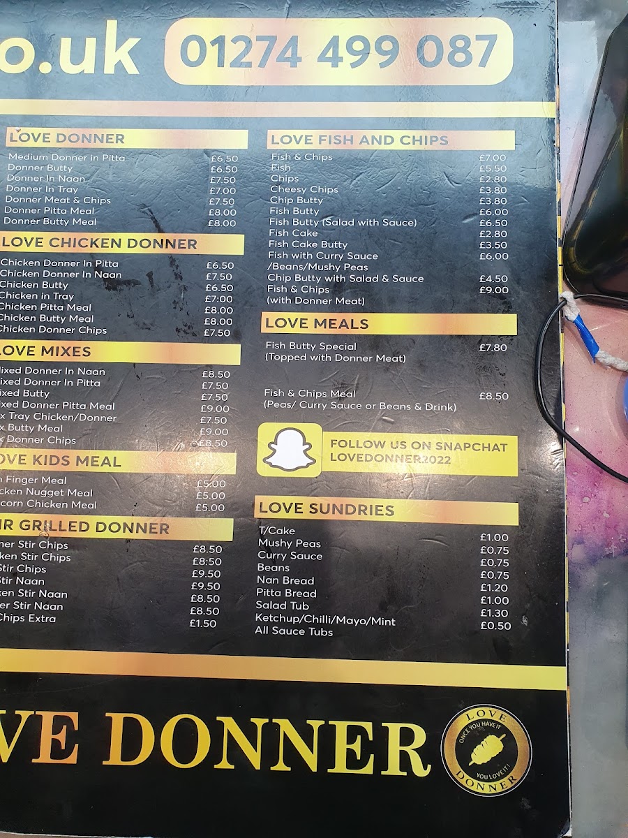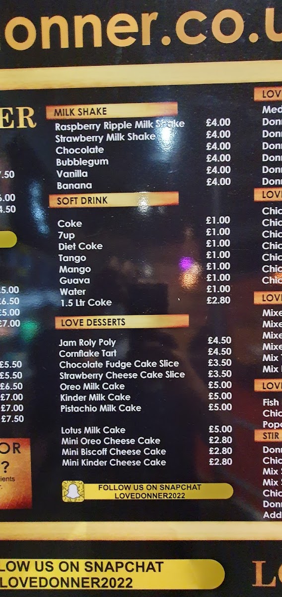 The menu at Love Donner offers a variety of takeaway options centered around doner kebabs and classic British fast food. It is structured into several distinct categories to help customers quickly find their preferred meals and accompaniments.