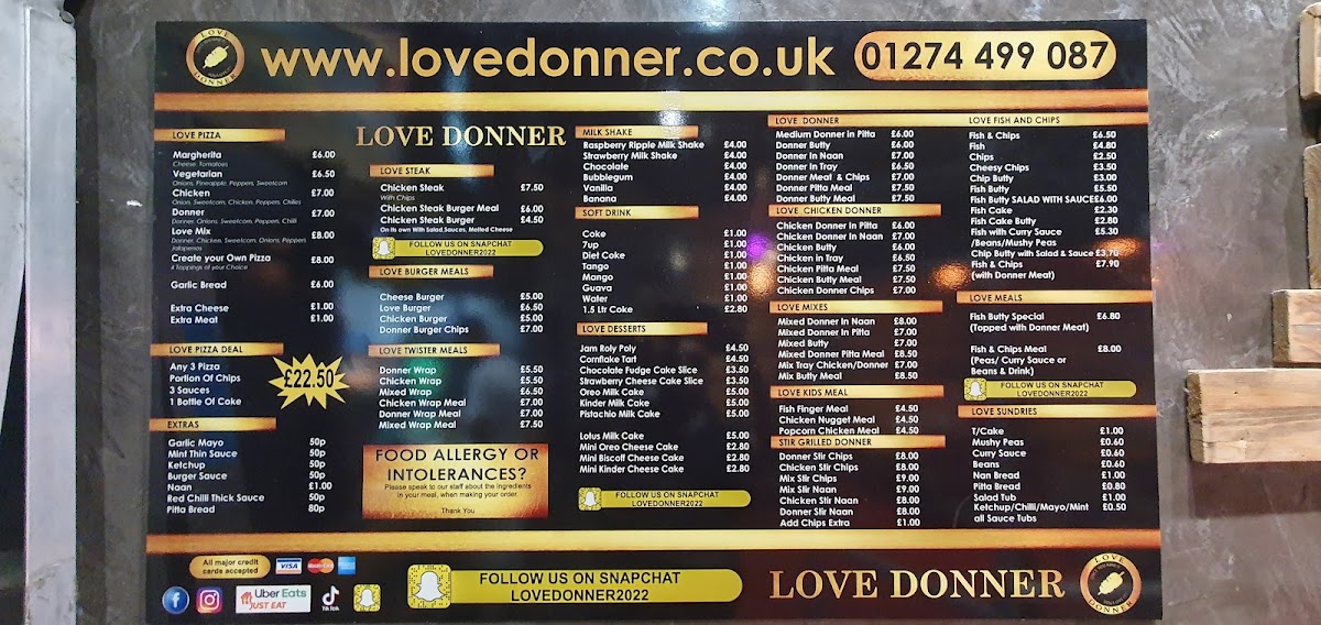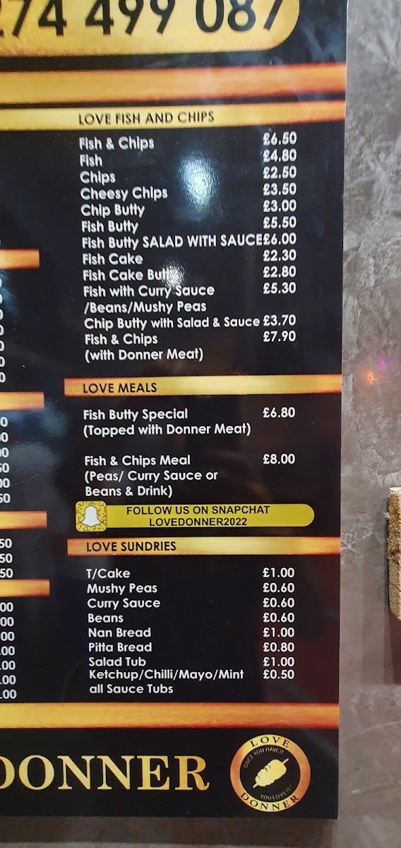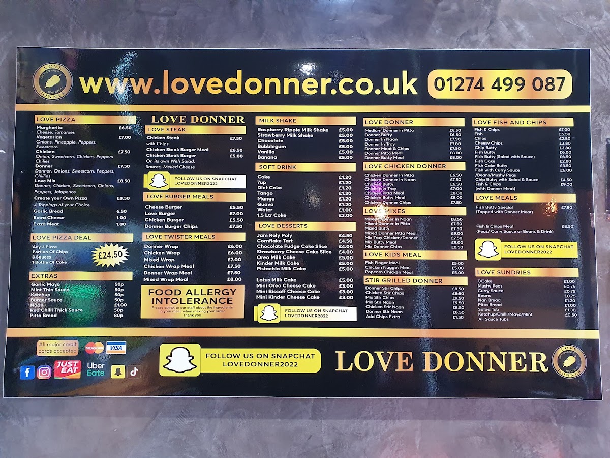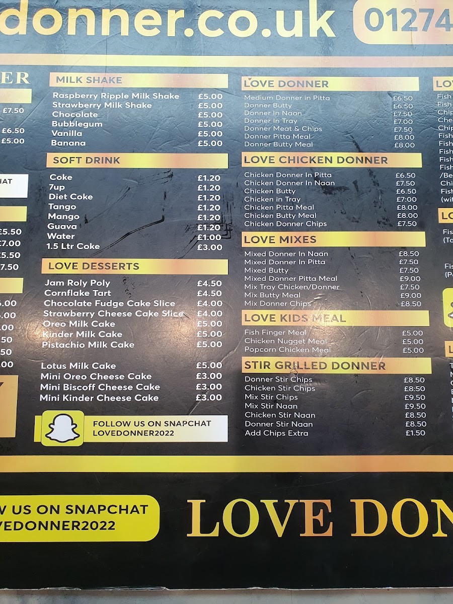 The menu at Love Donner offers a variety of takeaway options centered around doner kebabs and classic British fast food. It is structured into several distinct categories to help customers quickly find their preferred meals and accompaniments.