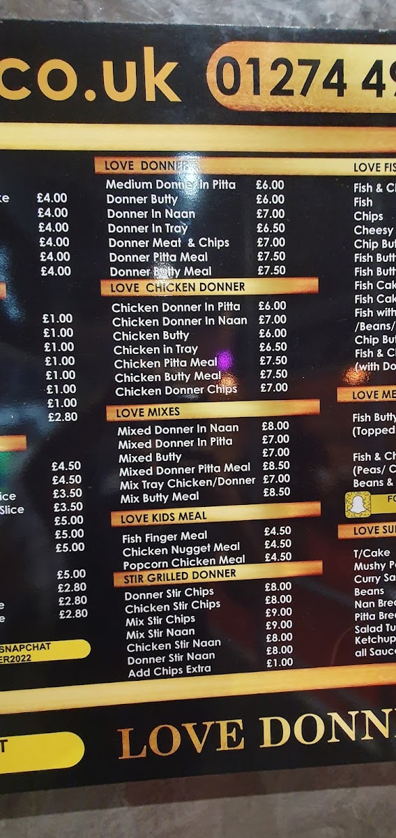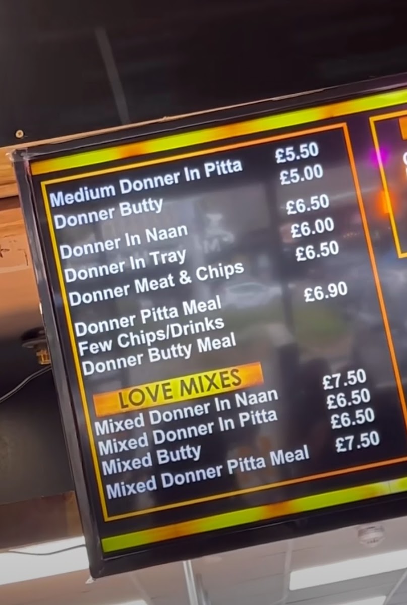 The Love Mixes section features combinations of doner meat served in different formats such as naan, pitta bread, and butty (a type of sandwich), with individual items and meal deals including chips.